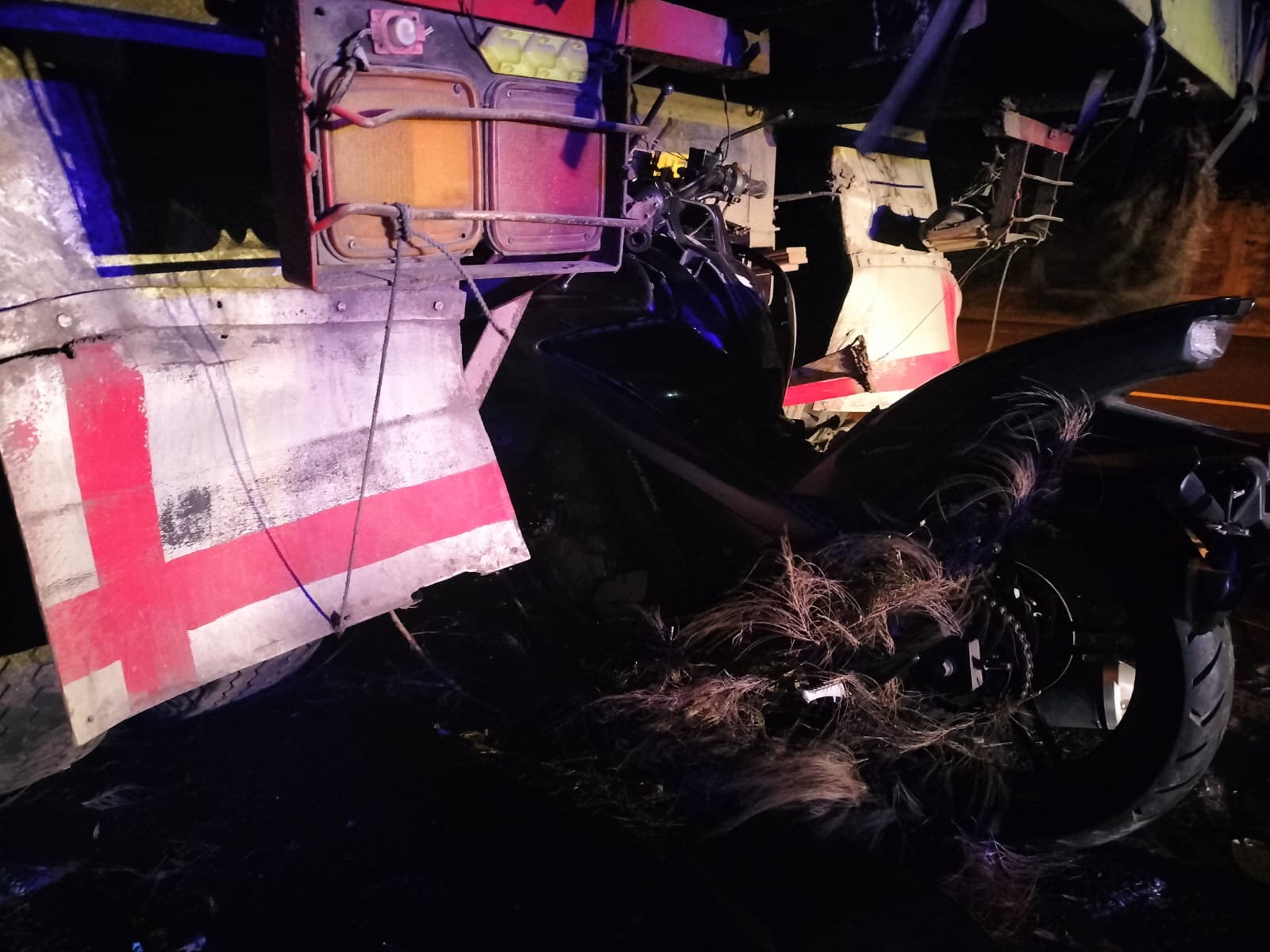 Selanjutnya, truk yang kondisi parkir tersebut langsung ditabrak sepeda motor tersebut dari belakang. Motor korban rusak parah karena menancap di bagian tengah truk gandeng itu.