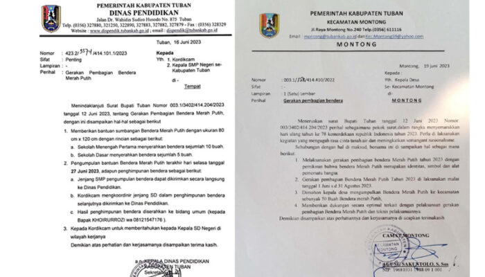 Tubannews.id – Pihak Dinas Pendidikan (Diknas) Tuban angkat bicara terkait dengan beradarnya surat dari Dinas Pendidikan (Diknas) Kabupaten Tuban yang meminta bantuan Bendera