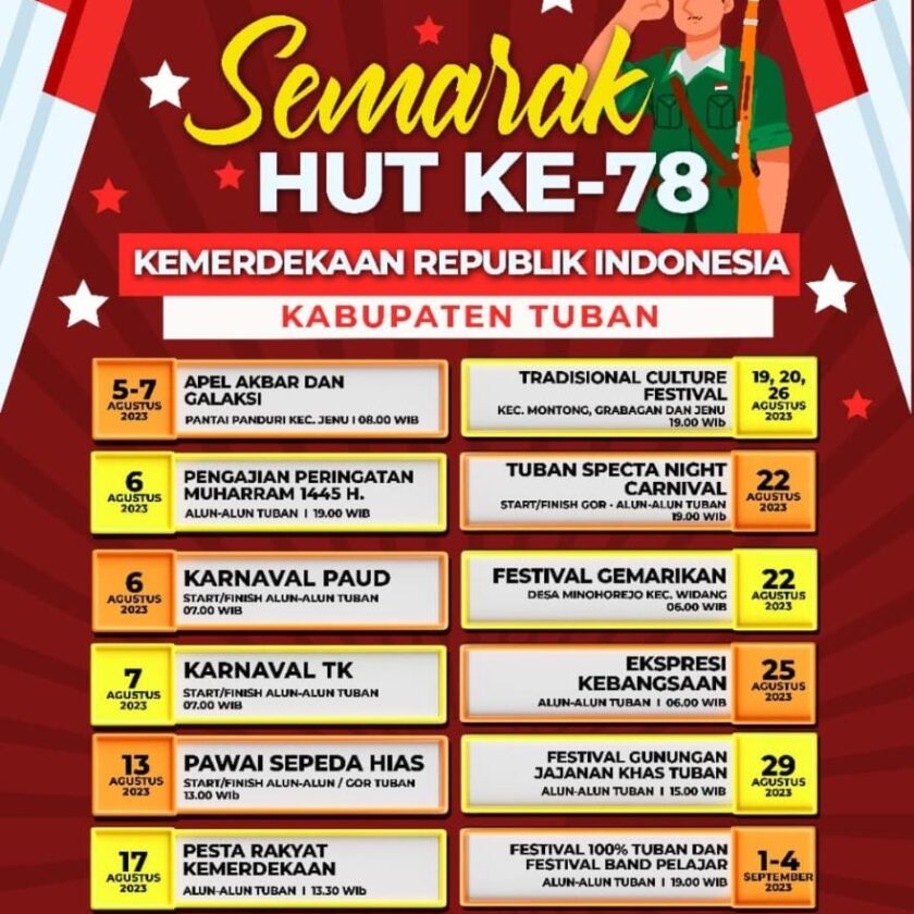Tubannews.id – Sejumlah kegiatan dan program dalam rangka menyemarakan Peringatan Hari Ulang Tahun Ke-78 Proklamasi Kemerdekaan Republik Indonesia telah disusun Pemkab Tuban. Sedikitnya